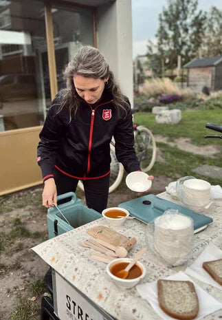 Die Suppe & Socken Pakete enthalten eine Mischung für einen Liter Kürbis Linsen Suppe und die Socken „Vloeibaar“ aus der Kollektion von Let’s do Goods. Diese Socken werden entworfen von Künstlerinnen und Künstlern mit gelebter Erfahrung in Obdachlosigkeit Sucht oder psychischen Problemen. Eine perfekte Runde voller Bedeutung Mitgefühl und echter Wirkung.
